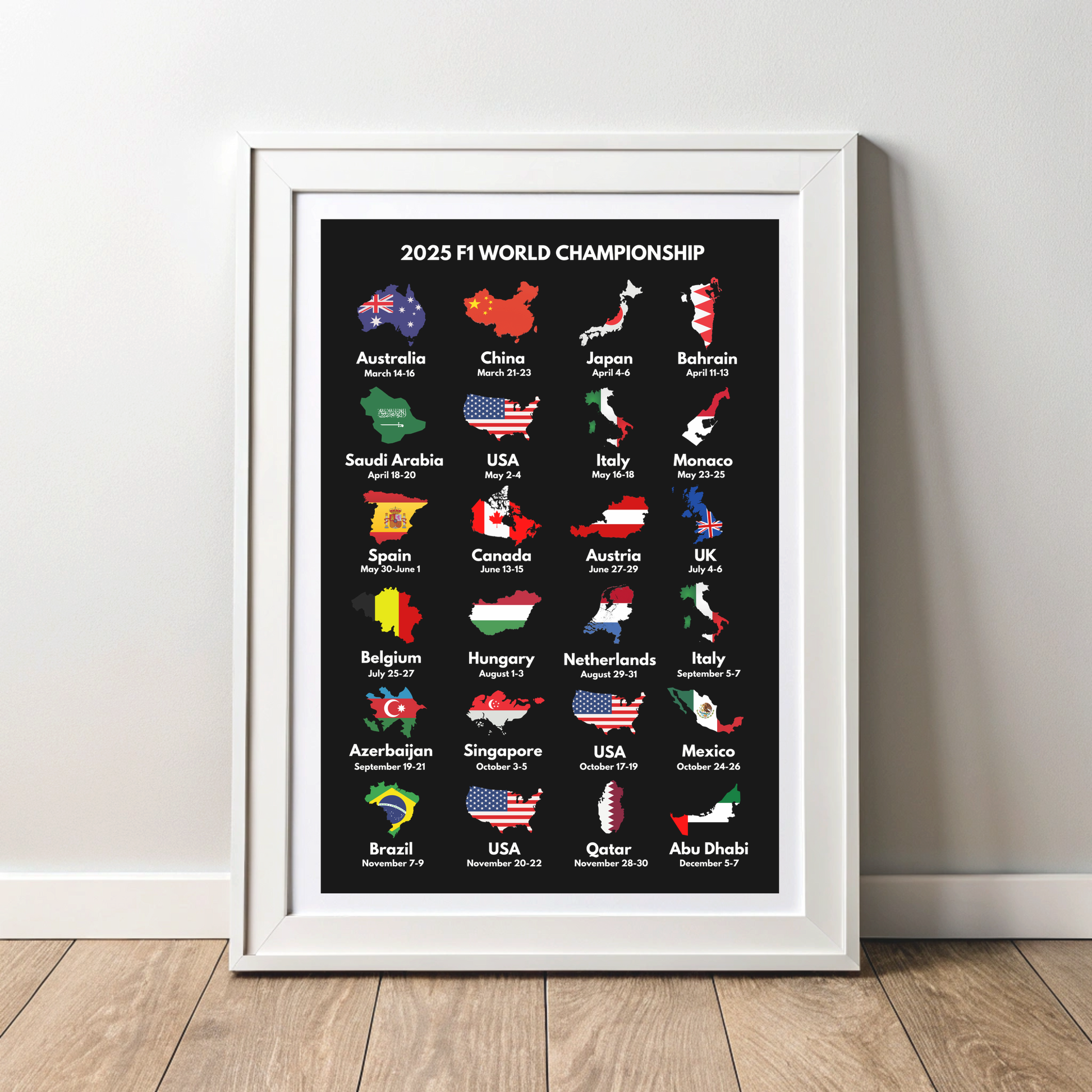 2025 Formula 1 World Calendar | Grand Prix Wall Premium Poster Print | F1 Gift | F1 Merch | Motorsport Gift & Home Decor l Framed